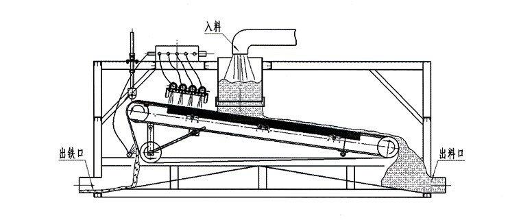 平板式磁選機(平板除鐵器),包括機架,機架上設(shè)有磁選機構(gòu)、張緊機構(gòu)、供水系統(tǒng)和勻料裝置,勻料裝置位于磁選斜面的低側(cè)與供水系統(tǒng)之間的輸送帶部分的上方,勻料裝置包括上下設(shè)置的勻料層,每個勻料層包括帶落料網(wǎng)孔的底部和設(shè)在底部周邊的擋料板,落料網(wǎng)孔均勻分布在勻料層的底部,擋料板首尾連接圍成接料口,落料網(wǎng)孔的孔徑與礦料的大小相應(yīng)的勻水裝置,包括位于磁選斜面的上方與沖料進(jìn)水管相接的噴淋管,噴淋管的正下方設(shè)有底部帶均勻通水孔的淋水器,噴淋管向下開有若干噴淋孔。